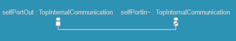 Regardless if ports are statically connected by connectors (wired ports), or dynamically connected at run-time (unwired ports), they must be compatible with each other. This means that the out-events of one port must match the in-events of the other port, for the ports to be possible to connect. This constraint ensures that events are never lost when traveling between two connected ports. To allow two connected ports to be defined using a single protocol, one of the ports can be declared conjugated. For a conjugated port the meaning of in-events and out-events are swapped, so that the in-events are the events that may be sent out through the port, and the out-events are the ports that may be sent to the port. A conjugated port is denoted with a ~ character. In the picture above port q1 is non-conjugated (