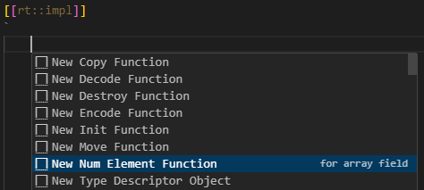 If you write your own type descriptor function it's important that its name exactly matches what is listed in this table. It's recommended to use Content Assist within the rt::impl code snippet to avoid typos and reduce typing effort.